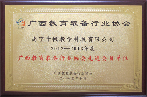 南寧千帆教學(xué)科技有限公司榮獲廣西教育裝備行業(yè)協(xié)會(huì)授予“2012-2013年度廣西教育裝備行業(yè)協(xié)會(huì)先進(jìn)會(huì)員單位”稱號(hào)。